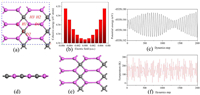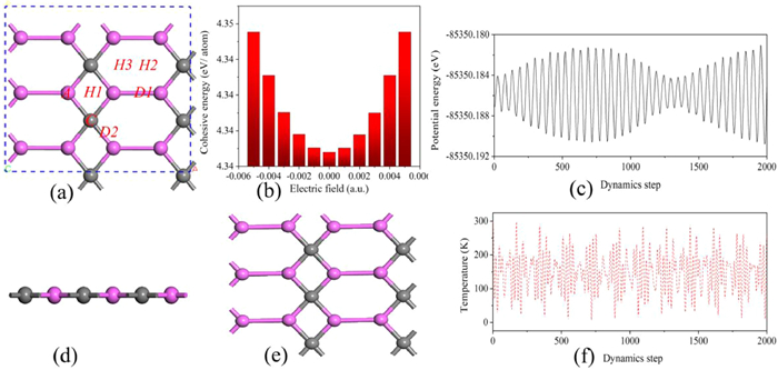 | Fig. 1. (a) Top (upper) and (d) side (lower) views of Al2C structure (2 × 3). C, H1, H2, H3, D1, D2 denote different adsorption sites on Al2C. Al atoms and C atoms are in magenta and gray, respectively. (b) The cohesive energy of Al2C nanosheet in an applied electric field. (c) Energy change and (f) temperature during molecular dynamics simulation of Al2C after 2000 fs at 300 K with an external electric field of 0.005 a.u. and (e) structure after 2000 ps at 300 K simulation. | |