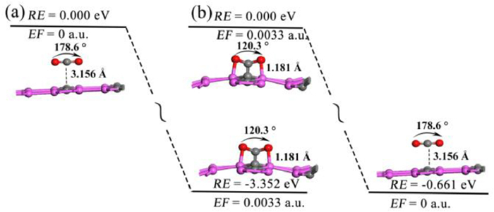 To explore whether the adsorption of CO2 on the Al2C surface can be regulated by the applied electric field, we investigated all possible adsorption structures of CO2 on the Al2C surface under positive and negative gradient electric fields (Fig. S2 in Supporting information). Comparing the adsorption configuration of CO2 in Fig. S2 when no/0.001 a.u. electric field is applied, it can be found that the bond angle of CO2 is slightly changed from 178.6° to 178.3° and the corresponding shortest adsorption distance is reduced from 3.156 Å to 3.123 Å. The Hirshfeld-charge transferred from Al2C to CO2 is reduced from 0.021 e− to 0.007 e−. The corresponding adsorption energy increases from −0.29 eV to −0.31 eV, indicating that the electric field at this point enhances the interaction between CO2 and A2C but it is still physical adsorption.
