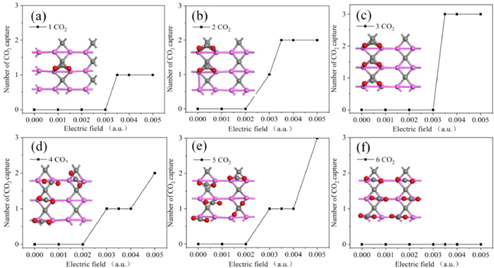 | Fig. 3. (a–f) The number of CO2 molecules captured with different positive electric field from 0 to 0.005 a.u. and corresponding structure. | |
