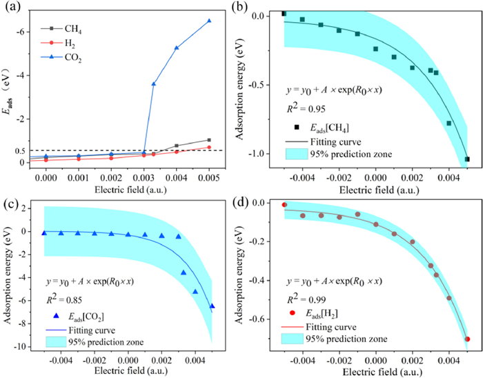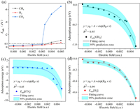 | Fig. 4. (a) The adsorption energies of the most stable configurations of CO2, H2, and CH4 on Al2C nanosheet in an applied electric field. The fitted tendency between electric field values and adsorption energies of (b) CH4, (c) CO2 and (d) H2. The fitted functions are written in the figures. | |