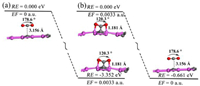 As shown in Figs. S4c and d (Supporting information), firstly, the molecular orbitals of the C=O bond below the Fermi energy level and the corresponding PDOS have a significant shift to a shallower energy level, and the bonding molecular orbitals of C=O have a cleavage leading to a significant decrease in the bonding strength. It is noteworthy that the antibonding orbital of the C=O bond moves to deeper energy levels (from 3.2 eV to 2.5 eV) and the area of the antibonding state increases, indicating that more empty orbitals constitute the antibonding orbital. It is interesting to note that the atomic orbitals constituting the bonding orbitals of the C=O bond at 0.004 a.u. electric field form two more prominent peaks at −1.8 eV and −2.3 eV, which are below the Fermi energy level but do not contribute to the bonding. Integrated COHP (ICOHP) was calculated by calculating the energy integral up to the highest occupied bands, and the value of ICOHP quantitatively reflected the strength of bonding. As shown in Fig. S4 (Supporting information), the value of ICOHP decreases with increasing electric field strength, which indicates that the bonding strength of the C=O bond decreases and the applied electric field can significantly activate the C=O bond but there is a minimum electric field strength of 0.0033 a.u. The above evidence also indicates that the applied positive electric field can effectively activate the C=O bond in CO2.