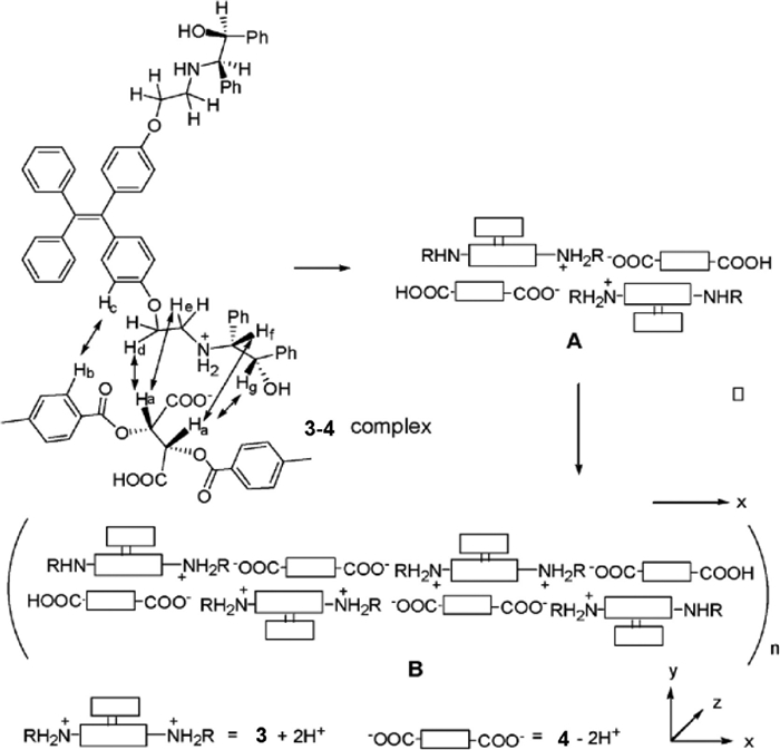 The mechanism of aggregates formation was explored using (1S,2R)-3 and enantiomers 4 (Fig. 1). 1H NMR titration, Job plots and mass spectra revealed that both d-4 and l-4 formed a 1:1 complex with (1S,2R)-3, and corresponding association constants were 6.3 × 104 and 1.3 × 104 L/mol, demonstrating the different binding force during enantiomers with (1S,2R)-3. 2D NOESY spectra indicated that methine protons of acid (Ha) were neared to protons of alkanoic chains (Hd, He, Hf and Hg) and the toluoyl group of the acid (Hb) was closed to Hc. The acid 4 approach to amine 3 from exterior of amino group, and the 3-4 complex formed by the acid-base interaction. By the dipole-dipole attraction of two acid-base ion pairs and hydrogen bonds, the tetramer complex A was formed. The obtained tetramers constituted a 1D network B by further acid-base interaction at the x direction and then the 3D nano-rod was formed by stacking of the B side by side at y and z directions. If the 1D network cannot form due to the insufficient interaction force in the tetramer complexes or the insoluble of tetramer, the aggregations will not produce. In aggregates, strong fluorescence will be observed, otherwise, the complexes will emit weak fluorescence.