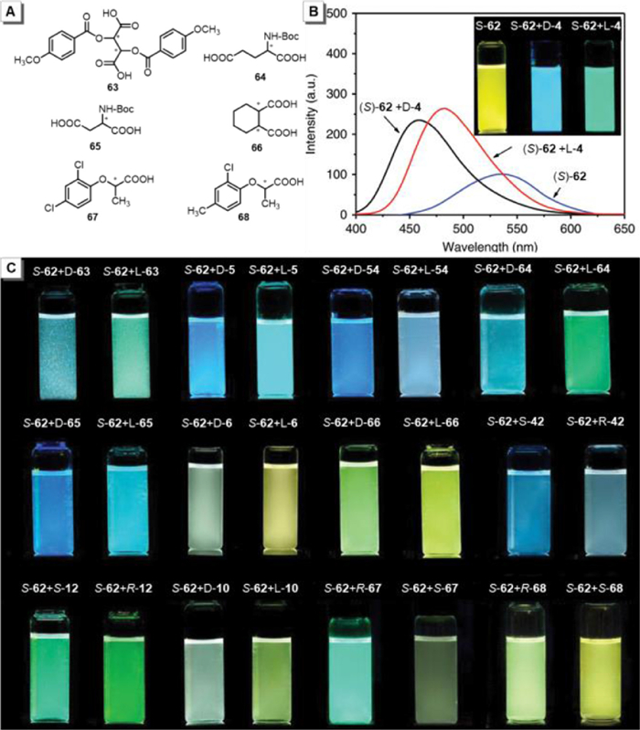 | Fig. 2. (A) Chemical structures of chiral carboxylic acids, (B) Emission spectra of (S)-62 after mixing with two enantiomers of 4 (4/(S)-62 = 2:1, molar ratio) in cyclohexane/acetone 98:2. Insets and (C) photos of solution of (S)-62 without and with chiral acid enantiomers under 365 nm light. Copied with permission [34]. Copyright 2020, Nature. | |
