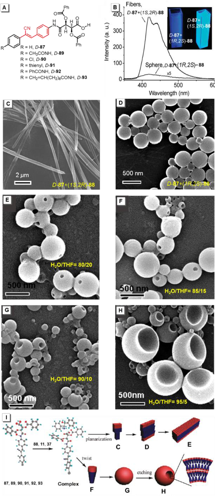 | Fig. 4. (A) Structures of d-87, 89-93; (B) PL spectra of d-87 interacted with enantiomers of 88; SEM image of mixture of (C) d-87 and (1S,2R)-88, (D) d-87 and (1R,2S)-88, [88] = [87] = 1.0 × 10−3 mol/L in water/ethanol (9:1, v/v). FE-SEM images of suspension of d-93 and (1R,2R)-18 in water/THF, v/v (E) 80:20; (F) 85:15; (G) 90:10 under no stirring ([d-93] = [(1R,2R)-18] = 1.0 × 10−3 mol/L). (H) Suspension of d-93 and (1R,2R)-18 in H2O/THF by evaporating THF 1:1 to 95:5 (v/v). (I) Schematic illustration for the formation of nanofibers, nanospheres, and hollow nanospheres with a hole. Copied with permission [39]. Copyright 2011, American Chemical Society. | |