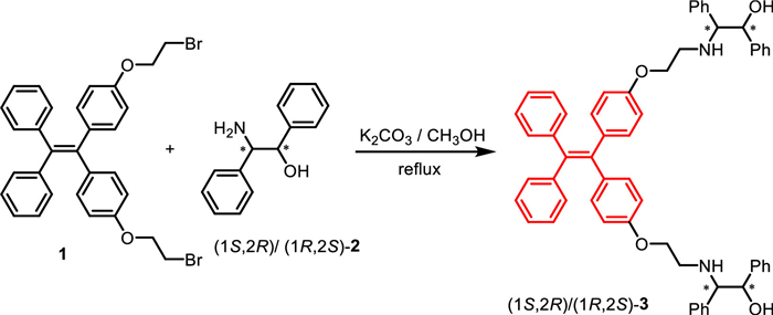 Although above-mentioned probes have showed excellent discrimination for enantiomers in organic solvents, it remains a problem that most of them are slightly soluble even insoluble in water. Poor water-solubility of probes may cause aggregation and result in aggregation-caused quenching (ACQ) effect, which limited their further applications [14]. To solve this problem, two major strategies are developed by researchers. The first one is to realize the large dispersion of molecules in the matrix, including doping [15], encapsulating [16] and polymerizing [17], but some additional processes are required. The second method is to develop a new kind of fluorophores to replace these traditional probes. In 2001, a propeller-like organic luminogen was found to be non-emissive in solution but fluoresce strongly in the aggregated state, this fascinating photophysical phenomenon was termed as aggregation-induced emission (AIE) by Tang for the first time [18]. The popular mechanism for AIE is restriction of the intramolecular motions in the aggregated state, including intramolecular rotations and vibrations [19]. AIE luminogens (AIEgens) effectively overcome ACQ and enriched the variety of fluorescent materials [20-23]. To date, a large number of AIEgens have been developed to apply in the area of theoretical study [24], bioimaging [25] and fluorescence recognition [26] with good performance. Remarkably, AIEgens bearing chiral fragments have served as ideal receptors for discriminating enantiomers thanks to AIE character. Generally, chiral AIEgens can enantioselectively complex with one enantiomer to form aggregates to emit strong fluorescence due to suitable configuration, but the weak interaction with the other enantiomer resulted in faint emission upon complexation. Thus, such differential fluorescence properties can be used to discern two enantiomers by fluorescence technique.