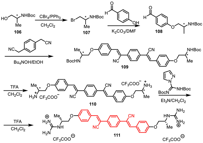 In 2017, the group of Shinkai reported that AIE compound 111 containing two chiral spacers could discriminate two enantiomers of 1,2-cyclohexanedicarboxylic acid 66 [43]. As shown in Scheme 13, compound 111 was synthesized in several steps by commercial material 106. In a mixed solvent of water and methanol, 111 was almost nonfluorescent. After adding 66, the fluorescence intensity of mixture was obviously increased, and RR-66 caused 10 times higher emission than SS-66 (Figs. 5A and B). Fluorescence microscopic images of the self-assembly morphologies indicated that compound 111 associated with sterically favorable RR-66, and delivered the fibrous supramolecular aggregate (Fig. 5C), whereas 111 combined with sterically less favorable SS-66, and afforded the finite aggregate (Fig. 5D).