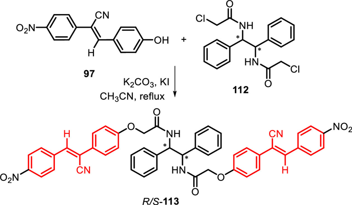 Base on the structure of cyanostilbene, R-113 and S-113 were facilely synthesized by our group (Scheme 14) [44]. To our delight, R/S-113 could selectively discriminate the enantiomers of chiral acidic compounds and amino acids with good enantioselectivity through acid-base and H-bonding interactions. As shown in Figs. S6A and B (Supporting information), the suspensions formed from a mixture of d-100 or d-26 and R-113, but the mixture of l-100 or l-26 with R-113 still maintained in solution. Enantioselectivity of two enantiomers of 100 and 26 were 17.9 and 5.9, respectively. For other chiral carboxylic acids depicted in Table 10, R-113 could differentiate their enantiomers with the fluorescence intensity ratio from 2.06 to 4.88. Due to the linear relationship between the fluorescence intensity and enantiomer composition, an unknown enantiomer excess value of 100 could be determined (Fig. 6C). Interestingly, R-113 also could detect arginine from 23 kinds of racemic amino acids or acidic compounds with a color change (Figs. S6D and E in Supporting information).