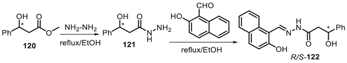 Schiff bases R-122 could be prepared by nucleophilic reactions of amine 121 and 2-hydroxy-1-naphthaldehyde and could discriminate the enantiomers of 34 and 18 by the intermolecular hydrogen bonds (Scheme 16) [47]. The (I0)/(I0) values of enantiomers of 34 and 18 were 0.4 and 0.36, respectively.