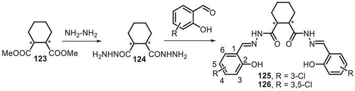 Chiral R,R-125 and S,S-126 were synthesized in short steps (Scheme 17) [48]. Because of the nonconjugated, flexible and multidentate structure of probes, they might form cavity easily for discriminating enantiomers of 42, and the (I-I0)/(I-I0) value of R,R-125 and S,S-126 are 0.38 and 3.59 for enantioselective recognition of R/S-42, respectively.
