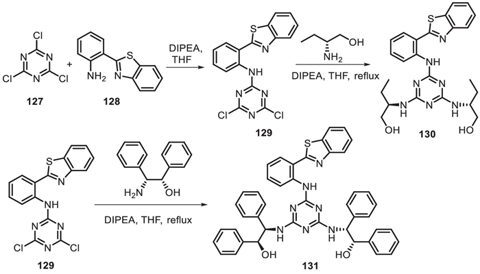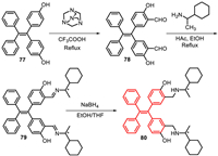 Apart from the AIE derivatives mentioned above, other AIE derivatives, such as compounds 130 and 131 also could be used for chiral recognition [49]. As shown in Scheme 18, 130 and 131 were synthesized by Bozkurt's group in two steps. Thanks to the multiple hydrogen bonds and steric hindrance, 4 kinds of chiral carboxylic acids could be recognized with good enantioselectivity. As depicted in Table 12, all enantiomers could enhance the fluorescence intensity of AIE compounds, and the R-enantiomer lead stronger emission than S-enantiomer. Compound 130 could discriminate enantiomers of 132, 12, 11 and 133 with enantioselectivity of 1.69, 2.59, 2.06 and 1.35, respectively. Similarly, the fluorescence intensity ratio between 131 and enantiomers of 132, 12, 11 and 133 were also obtained with 1.44, 2.42, 2.2 and 1.38.