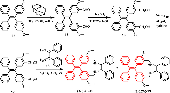 Amino acids are the basic structural units of biomacromolecules. However, enantioselective recognition of unprotected α-amino acids by a fluorescence method, which is especially challenging due to the zwitterionic property and slight solubility of α-amino acids [29]. To solve this problem, chiral macrocycle compounds (1S,2S)-19 and (1R,2R)-19 based on TPE were explored by Zheng's group (Scheme 2) [30]. As expected, both of them showed specific AIE properties and good recognition capabilities for α-amino acids.