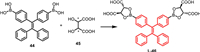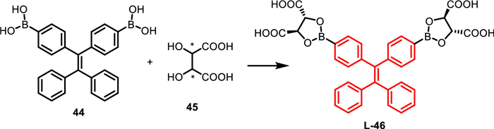 Not only single molecule, the ensembles l-46 can be also used in chiral recognition [32]. As shown in Scheme 4, l-46 was obtained by boric acid 44 and l-tartaric acid 45. In an EtOH/THF solution, the mixture of l-46 and (1S,2S)-34 emitted bright blue fluorescence, while the mixture of l-46 and (1R,2R)-34 showed weak emission (Table 4 and Fig. S2A in Supporting information). In addition, l-46 also could discriminate the enantiomers of 18 and natural alkaloids 47 (Table 4 and Figs. S2B and C in Supporting information).