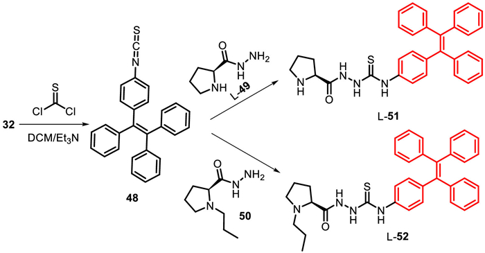 Chiral fluorescent probes l-51 and l-52 could be gained in two steps by amine 32 (Scheme 5). However, l-51 could be used in chiral recognition of unprotected amino acids, acids, amines and alcohols [33]. For amino acids, the mixture of d-53, d-26 or d-25 and l-51 induced suspension, but the mixture of l-53, l-26 or l-25 still remained a clear solution in the mixed solvents of THF and H2O, and the enantioselectivities were 1.9, 4.6 and 4.5, respectively. For acid 54, alcohols 41-43, amines 34, 37 and 55, l-51 could distinguish their enantiomers with enantioselectivity from 1.8 to 5.8 in the THF/H2O (Table 5). But l-52 showed poor selectivity in chiral recognition, this comparison indicated that hydrogen bonds between l-51 and enantiomers play key roles in chiral recognition.