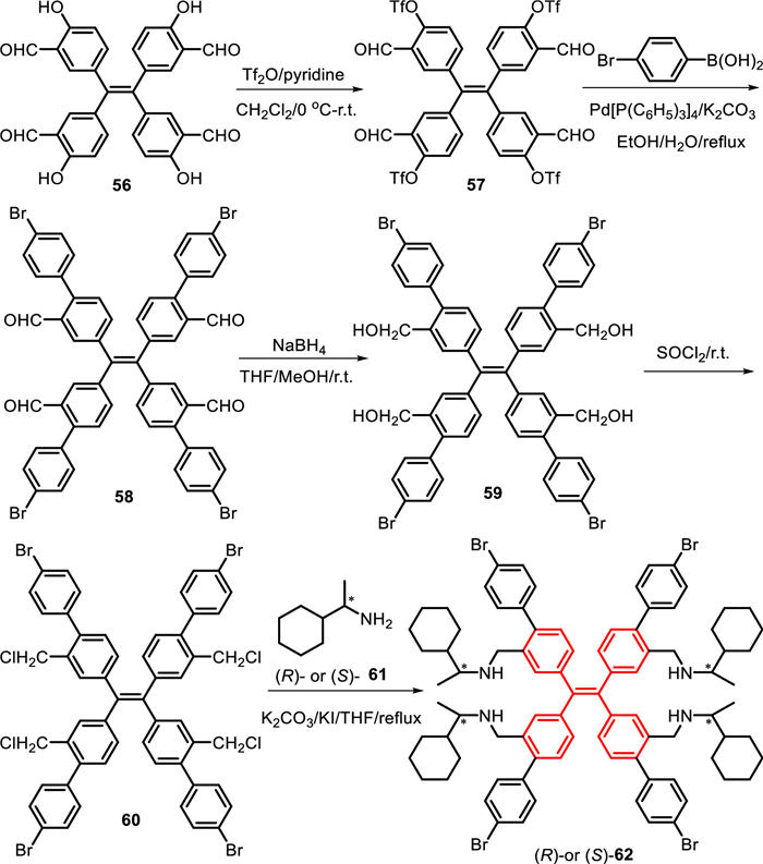 Remarkably, most chiral recognitions were based on fluorescence intensity changes of fluorescent probe and two enantiomers. Only very limited works on the chiral recognition based on emission wavelength change. In 2020, Zheng's group designed and synthesized chiral fluorescent probe S-62 that could discriminate enantiomers and give different colors [34]. S-62 was directly synthesized using compound 56 as the starting material (Scheme 6).