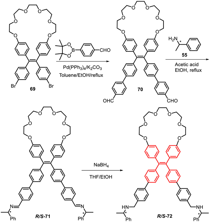 In 2021, a pair of chiral AIEgens R-72 and S-72 were synthesized by our group using 69 as a start material (Scheme 7) [35]. In the mixed solvents of n-hexane and THF, R-72 could recognize the two enantiomers of 21 and 4 with high selectivity of 12.6 and 5.9 (Figs. S3A and B in Supporting information), respectively. Besides the above acids, R-72 is also suitable for discriminating of camphorsulfonic acid 13 (I/I = 2.4), cysteine 73 (Id/Il = 6.5), Boc-phenylalanine 74 (Id/Il = 2.4) and Boc-serine 9 (Il/Id = 2.0) (Table 6).