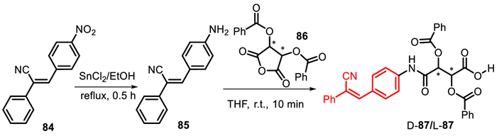 α-Cyanostilbene derivatives is one of typical AIE compounds [37]. In 2009, Zheng's group synthesized chiral d-87 and l-87 by 4-amino-α-cyanostilbene 85 and debezoyltartaric anhydride 86 in excellent yield (Scheme 9) [38]. As revealed in Table 8, aggregates formed selectively when l-87 mixed with (1R,2S)-88, S-37, (1R,2R)-18 or R-17 in DCE or mixed solvent. In aqueous ethanol, l-87 could discriminate the enantiomers of 88, 37, 18 and 55 with high enantioselectivity of 262, 10, 18 and 17, respectively. Correspondingly, when d-87 was mixed with (1S,2R)-88, R-37 or (1S,2S)-18, suspensions were more easily formed and showed strong fluorescence. In addition, the chiral excess could be determined by changes in fluorescence.