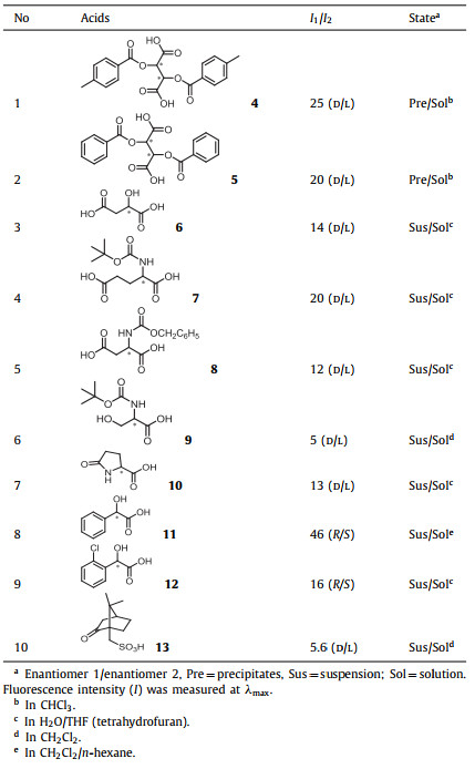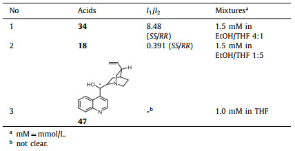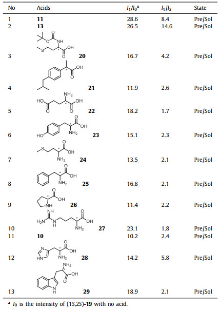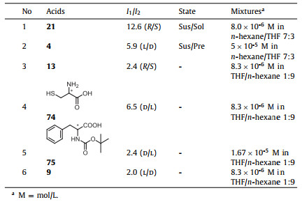 Table 1 The enantioselectivity (I1/I2) of (1S,2R)-3 resulted from two enantiomers of chiral acids. |
