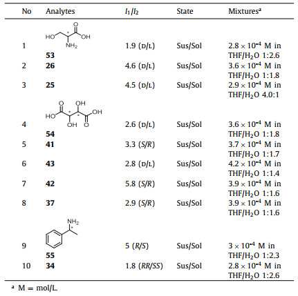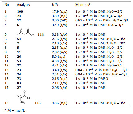 Table 4 Fluorescence intensity ratio and state of the mixture of enantiomer of analyte with l-46 in solvent. |