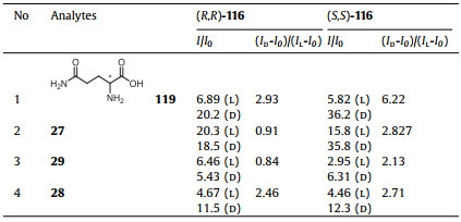 Schiff base derivatives occupy an importance position in analysis and detection of compounds [45]. For instance, Schiff bases 116-118 (Scheme 15) could be used as chiral probes of unprotected amino acids with different fluorescence intensity [46]. As shown in Table 11, Tables S3 and S4 (Supporting information), adding different amino acids to Schiff base solutions would enhance their fluorescence. R,R-116 could discriminate the enantiomers of 119 and 28 with (Id -I0)/(Il -I0) of 2.93 and 2.46, respectively. S,S-112 could discriminate the enantiomers of 119, 27, 29 and 28 with (Id -I0)/(Il -I0) of 6.22, 2.827, 2.13 and 2.71, respectively. R,R-117 had an excellent (Id -I0)/(Il -I0) of 4.89 for enantioselective recognition of d- and l-27. S,S-117 could discriminate enantiomers of 28 ((Id -I0)/(Il -I0) = 0.11). In addition, R,R-118 or S,S-118 also showed high (Id -I0)/(Il -I0) value for enantiomers of 27, 119 and 29.