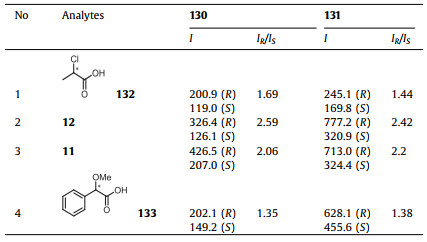 Table 12 Fluorescence intensity and intensity ratio of the mixture of R/S-carboxylic acids with 130 and 131 in DMSO:H2O = 40:60. |