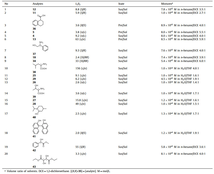 Table 3 Fluorescence intensity ratio and state of the mixture of enantiomer of analyte with (R,R)-35 in solvent. |
