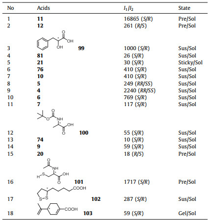 Table 9 Fluorescence intensity ratio and state of the two carboxylic acid enantiomers with (R,R)-98 in solvent(s). |