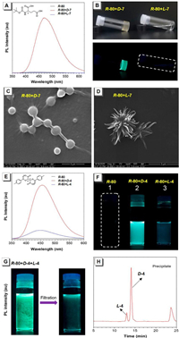 | Fig. 3. (A) PL spectra of R-80 and their mixtures of R-80 and d/l-7 in DCE. (B) Photos of a gel formed in the mixture of R-80 and d-7 and a solution formed in the mixture of R-80 and l-7 in DCE under daylight (top) and a portable 365 nm UV lamp (bottom). SEM images of the solution generated by (C) R-80 and d-7, (D) R-80 and l-7 in DCE. (E) PL spectra of R-80 and their mixtures of R-80 and d/l-4 in DCE. (F) Fluorescent photos of R-80 (1), a suspension of R-80 and d-4 (2), and a solution of R-80 and l-4 (3) in DCE. (G) Fluorescent photos of enantioselective separation of d-4 in the mixture of d-4 and l-4 using R-80. (H) Chiral HPLC results of the precipitates were analyzed on the chiral-phase column of CHIRALPAK IE. Copied with permission [36]. Copyright 2022, American Chemical Society. | |