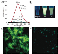 | Fig. 5. (A) Fluorescence spectra of 111 in the presence of RR-and SS-66 (1.0 mm for both) and (B) the corresponding photograph. Fluorescence microscopic images of the dispersions of 111/RR-66 (C) and 111/SS-66 (D). Conditions: [111] = 50 µmol/L, [66] = 1.0 mmol/L. Scale bar: 10 µm. Reprinted with permission [43]. Copyright 2017, Wiley-VCH Verlag GmbH & Co. KGaA. | |