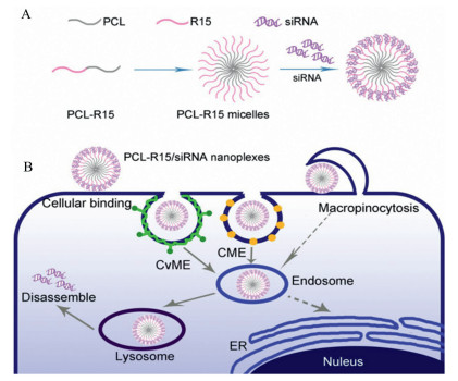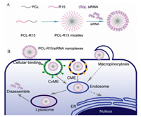 | Fig. 4. Synthesis and internalization mechanism of PCL-R15/siRNA nanoplexes. (A) Assembly process of PCL-R15/siRNA nanoplexes. PCL-R15 amphiphilic block polymer can be formed into micelles by self-assembly. Then the negatively charged siRNA was electrostatically adsorbed onto the surface of the positively charged micelles. (B) Mechanism of action of PCL-R15/siRNA nanoplexes. PCL-R15/siRNA nanoplexes enter cells through lectin, caveolae mediated endocytosis and macropinocytosis. The free siRNA is then released into the cytoplasm by the action of lysosomes to function. Copied with permission [111]. Copyright 2020, American Chemical Society Publishing Group. | |
