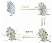 | Fig. 1. Solid phase synthesis. Firstly, the chloromethyl is introduced on the solid phase carrier. It is subsequently reacted with the amino acid protected by the amino group, and the first amino acid is solidly loaded onto the resin. Afterwards, multiple amino acids are introduced in the same manner to form poly(amino acid)s. | |