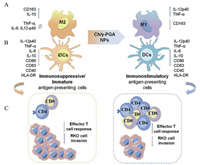 | Fig. 2. Ch/γ-PGA NPs mechanism of action. (A) Ch/γ-PGA NPs promote the conversion of M2-type macrophages to M1-type macrophages, promote positive immune response, reduce CD163 expression, and promote IL-12p40 and TNF-a secretion. (B) Ch/γ-PGA NPs, which are synthesized by the co-acervation method, induce an immunostimulatory dendritic cells phenotype and improve the endocrinology of the proinflammatory cytokines TNF-a, IL-12p40, IL-6 and the expression of the synergistic stimulation molecules CD86, CD40 and HLA-DR. (C) These transitions promote the activation and proliferation of CD4+ and CD8+ T cells, while also suppressing the invasive capacity of colorectal cancer cells. Copied with permission [57]. Copyright 2017, Elsevier Publishing Group. | |