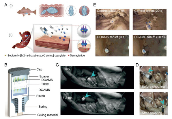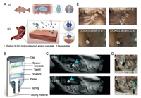 | Fig. 10. Application of ES-HFMs for mechanical interlocking based on thorny-headed worm. (A) (ⅰ) Thorny-headed worm attaches to the intestine of fish. (ⅱ) The micro-needle-like structures in the head of the worm expand as they penetrate the intestine, providing strong adhesion. (ⅲ) After intake, the "jack-in-the-box" system would automatically deploy into the tissues in reaction to the low pH environment in the stomach. (B) Schematic diagram of a device comprising a double DOAMS modified tablet. (C) The image display device from the high-speed camera is successfully triggered. (D) Pictures of the state of the double DOAMS modified tablets before and after initiation. (E) Endoscopic images showing the movement of control and individual DOAMS-modified tablets in the pig stomach. Copied with permission [106]. Copyright 2022, the Science Advances. | |