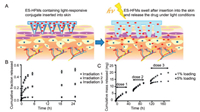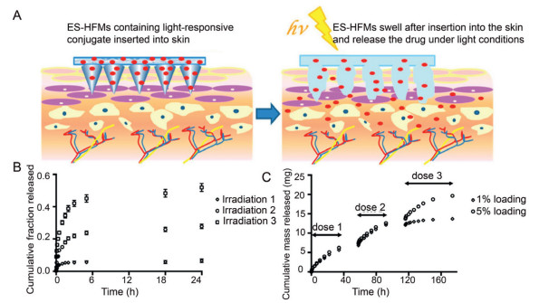 | Fig. 2. Materials for ES-HFMs. (A) Schematic representation of drug release from ES-HFMs made from light-responsive materials. (B) Cumulative fractional release profiles of ibuprofen from 3 × 3 ES-HFMs loaded with photoresponsive couplers over 3 irradiation cycles (irradiation 1/2/3) after 1 h of continuous irradiation at 365 nm. (C) Ibuprofen release from 3 × 3 ES-HFMs with release triggered by 3 cycles (dose 1/2/3) of exposure to light for 1 h. The 1% and 5% loading are ES-HFMs containing 1% and 5% light-responsive couplers. Copied with permission [42]. Copyright 2016, the American Chemical Society Publications. | |