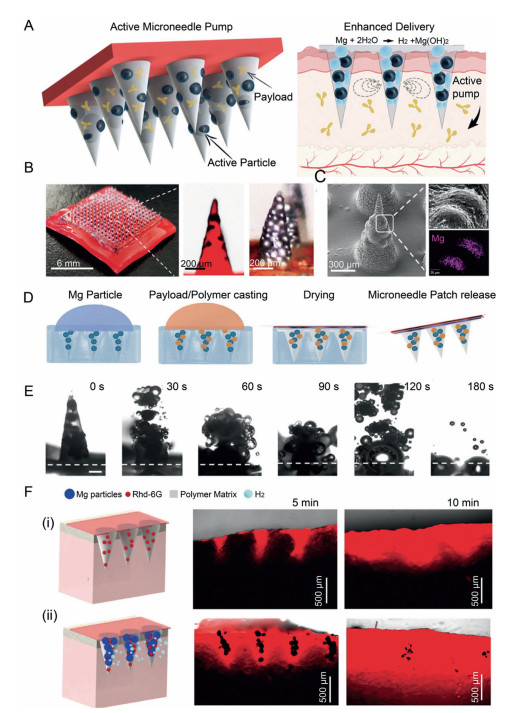 MN-mediated drug release generally relies on passive diffusion, where external stimuli (e.g., ultrasound, light, temperature) are often employed to improve drug delivery, avoiding the low penetration and uneven distribution of therapeutic agents [59,60]. For example, Lu Fan et al. proposed a strategy for versatile and controlled drug delivery by integrating photoresponsive drug delivery microspheres into pyramidal MNs [61]. Benefiting from the sufficient water content of the swellable hydrogel, the MN was able to load various bioactive substances with well-maintained biological activity, which could be delivered to a deeper location at the target site. Nevertheless, the demand of bulky external equipment limits its application as a result of the troublesome operation, specialist handling and high cost. Further efforts are thus necessary to incorporate the merits of autonomous and active drug delivery into a simple MN delivery platform, while decreasing the time and cost required to achieve significant therapeutic efficiency. Recently, nano-scaled components were encapsulated into the ES-HFMs to endow them with autonomous bioactive properties, facilitating the MN extension and drug diffusion. As an illustration, Miguel Angel Lopez-Ramirez et al. described a swellable hydrogel-based bioactive MN delivery platform loaded with a therapeutic payload and active motor magnesium (Mg) microparticles, which was capable of generating autonomous intense convective fluid flow to improve drug deployment (Figs. 4A-D) [62]. As the polymer matrix dissolves within the skin, the embedded magnesium particles were exposed and react instantly with the surrounding ISF to rapidly produce hydrogen bubbles (Fig. 4E). These microbubbles induce a powerful and autonomous swelling pumping effect, and thus result in dynamically and extremely efficient transport and penetration of the embedded therapeutic payload. In vitro evaluation using fluorescence dye as a model drug revealed that the encapsulated Mg particles greatly enhanced the effective loading and delivery of the model dye within 5 min compared to the delayed delivery of passive MNs (without Mg particles). This phenomenon was significantly more pronounced at 10 min, where the passive MN resulted in a mean depth of 111 ± 79 µm versus 526 ± 71 µm with the active MN (Fig. 4F). Distinctively, the active delivery strategy of ES-HFMs offers considerable promise for rapid and deep drug deployment with a sophisticated design and bioactive nanocomponent integration.