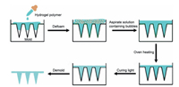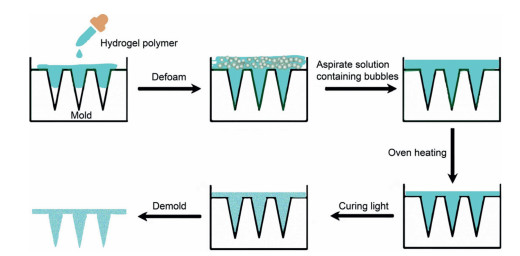 Nowadays, the HFMs have been extensively studied and exhibited great potential in deep point-of-care sampling, smart drug deployment, wound healing, mechanical interlocking, etc. (Table 1). Currently, the most widespread approach for ES-HFMs fabrication should be the micro-modeling, in which the polymer solution was filled into the prepared microneedle array mold by external forces such as heating, centrifugation, evacuation, and light-mediated crosslinking to form the microneedle array (Fig. 5). As an illustration, Na Xu et al. prepared swellable polyvinyl alcohol/polyvinylpyrrolidone hydrogel microneedle patches by casting the polymer solution into the polydimethylsiloxane (PDMS) molds followed by careful removal, which perfectly maintained the morphology and were able to penetrate the skin in the dry state to extract ISF [26]. Furthermore, in order to minimize tissue damage while achieving significant adhesion to soft tissues, Yun Yang et al. applied a similar method to create a stimulus-responsive bilayer microneedle via double casings of block polyacrylic acid (PS-b-PAA) block copolymer and polystyrene (PS) [58]. Briefly, when PS-b-PAA solution was added into a PDMS mold, capillary forces would induce a thick film near the conical cavity's tip, while a thin film was generated elsewhere on the mold surface. Subsequently, the PS homopolymer was then melted on top of the intact PS-b-PAA layer, and the microneedle patch was peeled from the PDMS after cooling to the room temperature.