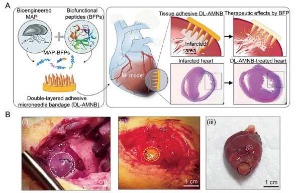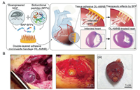 To repair severe tissue damage and skin scars, patches that significantly inhibit bacterial infection and accelerate wound healing are considered to be the most effective candidates [73-78]. Typically, the traditional formulation mainly included various active drugs (e.g., bactericidal, hemostatic, anti-inflammatory, and angiogenic factors) with adjuvants such as diverse nanoparticles [79-82]. Nonetheless, the complex biological and chemical fabrication procedures involved in conventional patches reduce biocompatibility and biosafety, thus further limiting their application in deep tissue injuries. Crucially, the single structure does not confer extensible and swellable dynamic shape alteration properties to the typical patches, and thus fails to provide real-time traction and fixation effects for tissue repair. As a result, it is expected to develop multifunctional patches for wound healing in combination with the tunability of hydrogel interactions and the superior microstructure of MNs [83-88]. Junjie Chi et al. invented a biomass chitosan-ES-HFMs by utilizing poly(N-isopropylacrylamide) hydrogel as an intelligent temperature responsive system, which was able to encapsulate vascular endothelial growth factor (VEGF) in the micropores [89]. Precisely controlled release of VEGF was achieved through exposure to different temperatures that cause the poly(N-isopropylacrylamide) hydrogel to extend/contract, thus accelerating inflammation inhibition, collagen deposition, angiogenesis and granulation tissue formation. Furthermore, Soomee Lim et al. proposed a double-layered adhesive MN bandage (DL-AMNB) as a therapeutic cardiac patch, which consisted of a biofunctional mussel adhesive protein-based root and a regenerating filamentous protein-based tip (Fig. 8) [90]. The system evidently displayed better cardiac muscle preservation and wound healing compared to the conventional cardiac patches in a rat myocardial infarction model, possibly owing to highly efficient delivery and long-term retention of the therapeutic peptide (i.e., vascular endothelial growth factor, fibroblast growth factor-2 and extracellular matrix protein), as well as the safe adhesion between the patch and the host myocardium via the intense underwater adhesion similar to mussel adhesive protein.