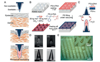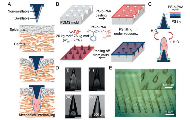 | Fig. 9. Application of ES-HFMs for mechanical interlocking. (A) The mechanical interlocking of ES-HFMs after tissue penetration. (B) ES-HFMs were prepared using PDMS molds and show the chemical structure of polystyrene-block-poly-acrylic acid (PS-b-PAA), where the weight fraction of polystyrene used for the expandable tip is 25%. (C) Schematic diagram showing the internal structure and reversible water reactivity of a bilayer MN. (D) Side views of hollow MNs (without polystyrene core) with different PS-b-PAA filling ratios, including (ⅰ) 20%, (ⅱ) 40% and (ⅲ) 70%. (ⅳ) Bilayer MN with expandable tip after filling with polystyrene core. (E) Photograph of ES-HFMs at a density of 10 × 10 cm−2, showing high pattern fidelity. Copied with permission [58]. Copyright 2013, the Nature publishing group. | |
