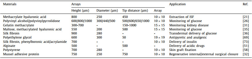 Due to the heterogeneity of the skin and unavoidable movement during puncture, ES-HFMs are subject to a variety of mechanical interactions, leading to fracture, bending, and other deformations, which affect the puncture performance [26,35,43,44]. Therefore, besides the matrix material, the engineering structure of the MNs such as length, shape, density, and spacing distance between each needle play a significant role in the penetration and removal processes [45-47]. The length of the MNs needs to be optimized to guarantee that the needles penetrate the skin whilst avoiding touching the underlying nerve endings, hence most MNs are approximately 25 µm to 2500 µm in length, 50 µm to 250 µm in width, and 1 µm to 25 µm in tip diameter [48]. Over-dense MNs would result in a "bed of nails" effect, which makes it difficult to effectively break through the stratum corneum barrier. At the same time, it decreases the MNs spacing, which remarkably reduces the penetration rate especially when the spacing is below 150 µm. According to a recent study, a density of fewer than 2000 needles/cm2 would be more favorable in terms of effective skin penetration [49,50]. For example, Zequan Zhou et al. constructed a Ca2+ cross-linked alginate ES-HFMs (round, 500 µm height, 500 µm spacing, 145 tips), which significantly improved the drug transdermal penetration, especially for acidic drugs [51]. Noticeably, differences in matrix materials, geometry parameters, and applicable targets may lead to variations in results, a further systematic exploration is still necessary to study the relationship between engineering structure and ES-HFMs performance to provide sufficient controllability, effectiveness and safety.