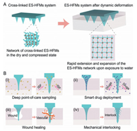 | Fig. 1. Schematic representation of the dynamic deformation of ES-HFMs. (A) Rapid extension and swelling of the compressed network of ES-HFMs when exposed to water, demonstrating excellent dynamic shape alteration capabilities. (B) Typical ES-HFMs applications including deep point-of-care sampling, smart drug deployment, wound healing and mechanical interlocking are illustrated. | |