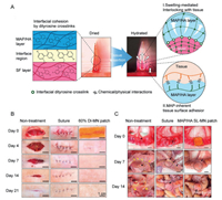 | Fig. 3. Engineering structure of ES-HFMs. (A) Schematic diagram of the working mechanism of ES-HFMs, a patch consisting of a swellable and adhesive mussel adhesive proteins (MAP)-based shell and a non-swellable silk fibroin (SF)-based core. (B) Macroscopic images of rat skin wound healing after non-treatment, suture treatment and 60% double-layered MN (DL-MN) treatment. (C) Macroscopic images of a 5 mm diameter defect in the rat ileum after untreated, suture-treated and mussel adhesive protein/hyaluronic acid single-layered MN (MAP/HA SL-MN) treatment. Defect (black star), treated site (black dashed circle), the border between attached bowel (yellow dashed line), adhesion site indicating intestinal canal (yellow arrow), fatty attachment (black arrow) and leakage (yellow triangle). Copied with permission [32]. Copyright 2019, the Elsevier. | |