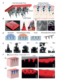 | Fig. 4. Bioactive nanocomponents of ES-HFMs. (A) The active MN patch component, as well as the built-in Mg particles that act as a pump when in contact with body fluids, are activated, thus enhancing drug release. (B) Digital photograph showing an optical/fluorescent microscope image of a 15 × 15 MN array and an active MN tip. (C) SEM image of a single active MN tip and EDX analysis of Mg. (D) Manufacturing steps for MNs: poly(dimethylsiloxane) microforming on the primary MN, poly(dimethylsiloxane) negative MN demolding, Mg particle loading, polymer and payload inclusion, polymer drying, adhesive application and peeling. (E) Microscope time frame image is taken from a single reactive MN point, clearly showing the dissolution of the polymer in PBS pH 6.0 and the activation of the particles (at 30-second intervals). (F) Schematic diagram illustrating the experimental set-up of passive (ⅰ) and active (ⅱ) MNs penetrating pig skin, and cross-sectional images of fluorescence microscopy at different times. Copied with permission [62]. Copyright 2020, the Wiley. | |
