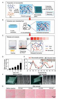 | Fig. 6. Application of ES-HFMs for deep point-of-care sampling. (A) Preparation of PVA/CS hydrogel ES-HFMs. (B) Target biomarkers were extracted from simulated skin in vitro and rabbit dorsal skin in vivo. (C) Recovery of target biomarkers from ES-HFMs by heating and detection using a colorimetric assay (darker color indicated higher glucose concentration). (D) The mass of ISF extracted from rabbits by the patch increased with extraction time and reached 1.25 ± 0.37 mg after 10 min. (E) Glucose levels obtained by ES-HFMs and a commercial glucose meter were excellent consistent in terms of quality and quantity. (F) Images before and after insertion of ES-HFMs into the skin of rabbits showing no breakage despite a slightly blunted needle tip. (G) Microchannels on the skin surface of the rabbit's back disappeared rapidly within 3 min after removal of ES-HFMs. Copied with permission [67]. Copyright 2020, the Wiley. | |