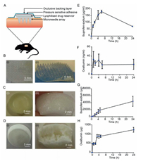 | Fig. 7. Application of ES-HFMs for smart drug deployment. (A) Schematic diagram of the application and retention strategy for rat experiments designed to assess the in vivo performance of ES-HFMs. (B) After 24 h of insertion, despite extensive swelling, ES-HFMs can still be removed intact from rat skin. (C) Digital image of a lyophilized wafer loaded with sodium ibuprofen. (D) Digital image of lyophilized wafer loaded with OVA. The plasma concentration of ibuprofen sodium (E) and OVA (F) in rats after transdermal administration using ES-HFMs. (G) Cumulative permeation profile of ibuprofen sodium in porcine skin by in vivo ES-HFMs combined with a lyophilized drug reservoir. (H) Cumulative permeation profile of OVA in porcine skin by in vivo ES-HFMs combined with a lyophilized drug reservoir. Copied with permission [68]. Copyright 2014, the Plos One. | |