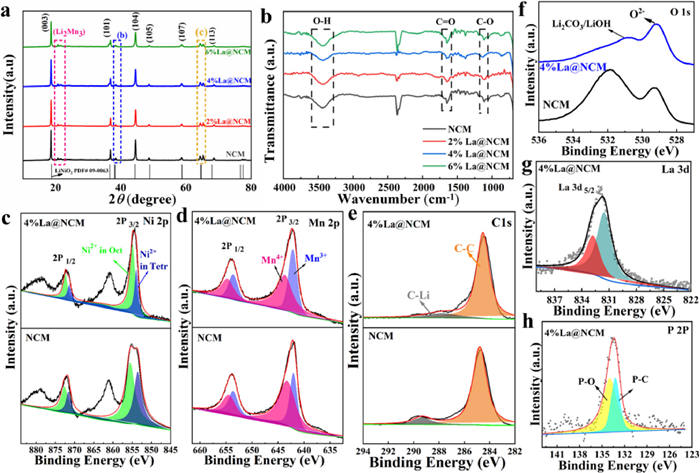 | Fig. 2. (a) XRD patterns and (b) FTIR spectra of NCM, 2% La@NCM, 4% La@NCM, 6% La@NCM. XPS spectra of (c) Ni 2p, (d), Mn 2p, (e) C 1s and (f) O 1s of the NCM and 4% La@NCM. XPS spectra of (g) La 3d and (h) P 2p of 4% La@NCM. | |
