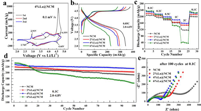 | Fig. 3. (a) CV curves of the 4% La@NCM. (b) The initial discharge-charge curves, (c) The rate performance and (d) cycling performance of the cells. (e) Nyquist plots of samples after one hundred cycles. | |