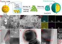 The schematic diagram showing the preparation and mechanism of the lithium-rich manganese-based cathode material is illustrated in Fig. 1a. Li1.2Ni0.16Mn0.56Co0.08O2 (NCM) was prepared by using co-precipitation method firstly, weigh the appropriate amount of La(PO3)3 into the beaker with ethanol ultrasonically dispersed, add the obtained NCM slowly to the solution, stir for 3 h, and then the modified cathode material, namely La@NCM, was obtained under suitable sintering conditions. The morphology and EDS analysis of the as-prepared smples were investigated by SEM (Figs. 1b and c, Figs. S1a-d in Supporting information). The SEM morphologies of all samples are not very different, and the particle size does not change abruptly after coating, which is about 100–150 nm. Fig. 1d shows the elemental distribution of 4% La@NCM, it can be seen that Li, Ni, Mn and Co are uniformly distributed on the surface of the material, and La and P elements are also detected, indicating the successful La(PO3)3 coating formation.