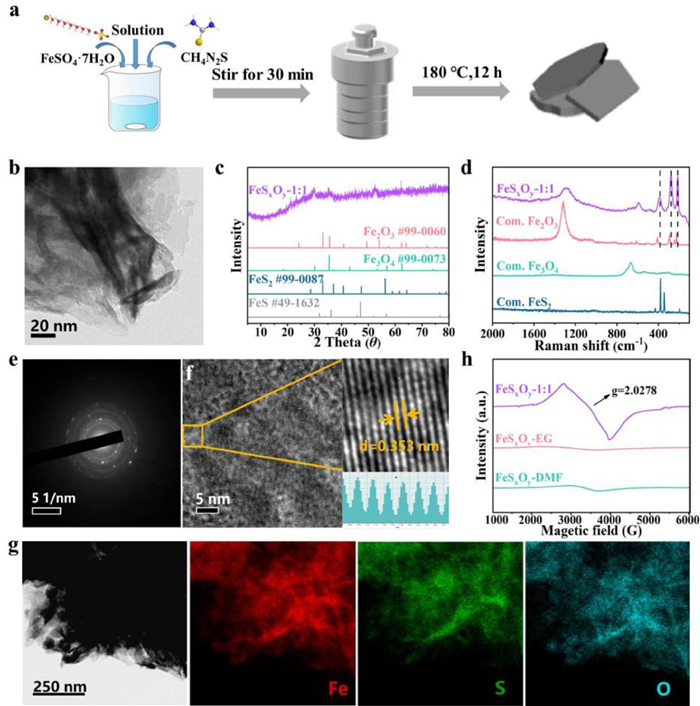 | Fig. 1. (a) Schematic illustration showing the preparation of FeSxOy-X. (b) TEM image of FeSxOy-1:1. (c) XRD pattern of FeSxOy-1:1 and Powder Diffraction File card of Fe2O3, Fe3O4, FeS2 and FeS. (d) Raman spectra of FeSxOy-1:1, Commercial Fe2O3, Commercial Fe3O4 and Commercial FeS2. (e) SAED image of FeSxOy-1:1. (f) HRTEM image of FeSxOy-1:1. (g) Solid EPR spectra of FeSxOy-X at room temperature. (h) EDX Mapping of FeSxOy-1:1. | |