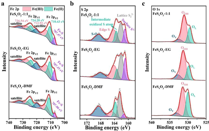 | Fig. 2. (a) Fe 2p, (b) S 2p and (c) O 1s XPS spectra of FeSxOy-X. | |