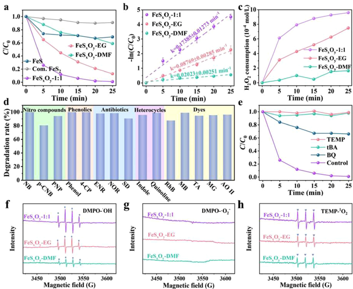 | Fig. 3. Degradation behavior of the FeSxOy-X-based Fenton system (pHi ≈ 4.0, [Quinoline] = 20 mg/L, [Catalyst] = 10 mg, [H2O2] = 1.47 mmol/L): (a) Quinoline degradation by different catalysts. (b) Observed rate constant of FeSxOy-1:1, FeSxOy-EG and FeSxOy-DMF. (c) Hydrogen dioxide consumption of FeSxOy-1:1, FeSxOy-EG and FeSxOy-DMF. (d) Degradation rate of nitro compounds, phenolics, antibiotics and dyes of FeSxOy-1:1 ([pollutant] = 20 mg/L). (e) Inhibition effect of radical scavengers on Quinoline degradation in the FeSxOy-1:1-based Fenton system ([t-BA] = 50 µL, [BQ] = 2.31 mmol/L, [TEMP] = 0.462 mmol/L). EPR spectra of (f) DMPO-•OH, (g) DMPO-•O2− and (h) TEMP-1O2 from the FeSxOy-1:1-based Fenton system. | |