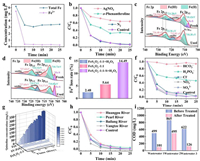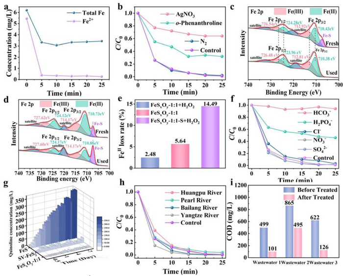 | Fig. 4. (a) Leaching of Fe2+ and total iron ions in the FeSxOy-1:1-based Fenton reaction. (b) Inhibition effect of AgNO3, 1, 10-phenanthroline and N2 on Quinoline degradation in the FeSxOy-1:1-based Fenton system ([AgNO3] = 1 mmol/L, [o-Phenanthroline] = 0.1 mmol/L, [Quinoline] = 20 mg/L), [Catalyst] = 10 mg, [H2O2] = 1.47 mmol/L, pHi ≈ 4). (c) Fe 2p spectra of fresh and used FeSxOy-1:1. (d) Fe 2p spectra of fresh and used FeSxOy-1:1-S. (e) Divalent iron loss rate on the surface of catalysts. (f) Inhibition effect of different anions on Quinoline degradation in the FeSxOy-1:1-based Fenton system. ([Anions] = 10 mg/L, [Quinoline] = 20 mg/L), [Catalyst] = 10 mg, [H2O2] = 1.47 mmol/L). (g) Long term degradation of Quinoline by FeS, SV-FeS2 (SV: Sulfur vacancy) and FeSxOy-1:1, respectively. (h) Quinoline degradation in natural water in the FeSxOy-1:1-based Fenton system. (i) Wastewater treatment by the FeSxOy-1:1-based Fenton system. | |